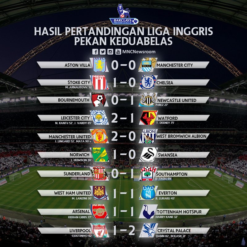 MNC NEWSROOM menge-tweet: #SportsInfo - Hasil pertandingan @premierleague pekan 12. @LFC kalah 0-1 kontra @CPFC. Derby North London imbang.